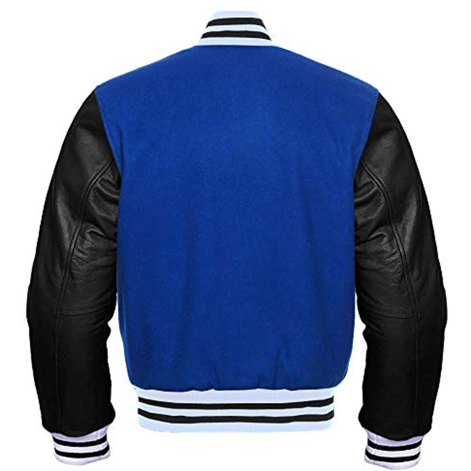 Varsity Jacket made from Molten wool body & Genuine Leather Sleeves (Cowhide, Sheep Skin & Buffalo) with fine quality polyester quilted lining in side of Jacket, Rib on collar, Buttons on front of Jacket, cuff & bottom of Jacket, Internal and External pocket.