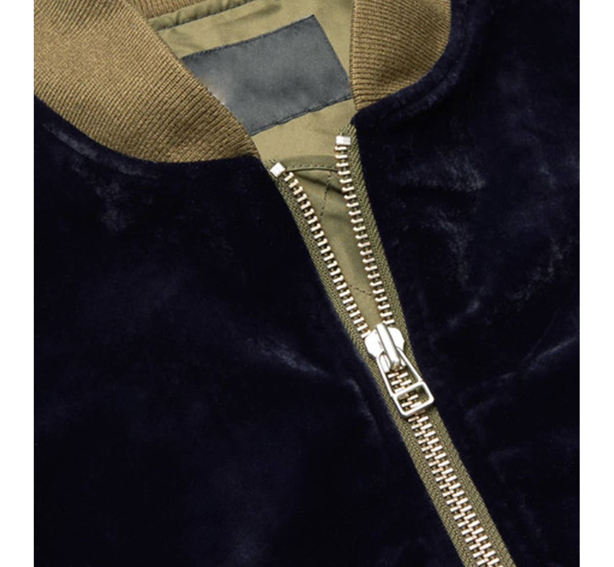 Varsity Bomber Jacket made from Trimmed Velvet body with fine quality polyester quilted lining in side of Jacket, Rib on collar, Buttons on front of Jacket, cuff & bottom of Jacket, Internal and External pocket.